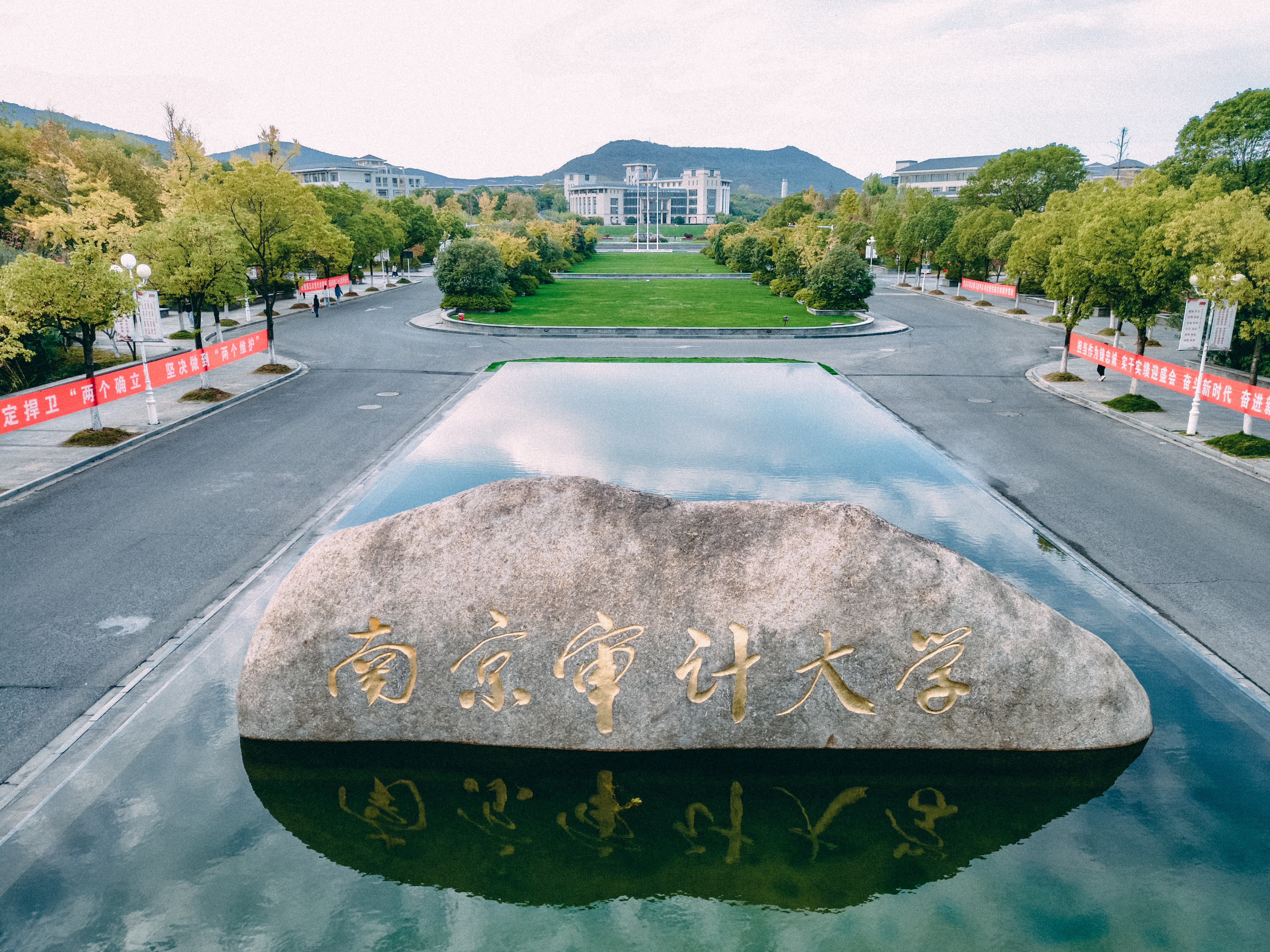 校園大門可概括為“門中門,門非門、非常門”,校名由第四任審計長,第十一屆全國政協(xié)副主席,南京審計大學(xué)名譽(yù)校長李金華親筆題詞,巨石勒名,未作雕飾寓意獨(dú)立真實(shí);其形勢與背景老山十分契合。
