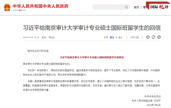 “當(dāng)?shù)弥?xí)主席給我們回信時(shí),我非常激動(dòng)、非常開心?;貒?guó)后,我將把我在中國(guó)學(xué)到的審計(jì)知識(shí),用到國(guó)家建設(shè)中?!?日,南京審計(jì)大學(xué)審計(jì)專業(yè)碩士國(guó)際班學(xué)生、來(lái)自馬拉維的吳娜,對(duì)中國(guó)中央廣播電視總臺(tái)的記者這樣說(shuō)。