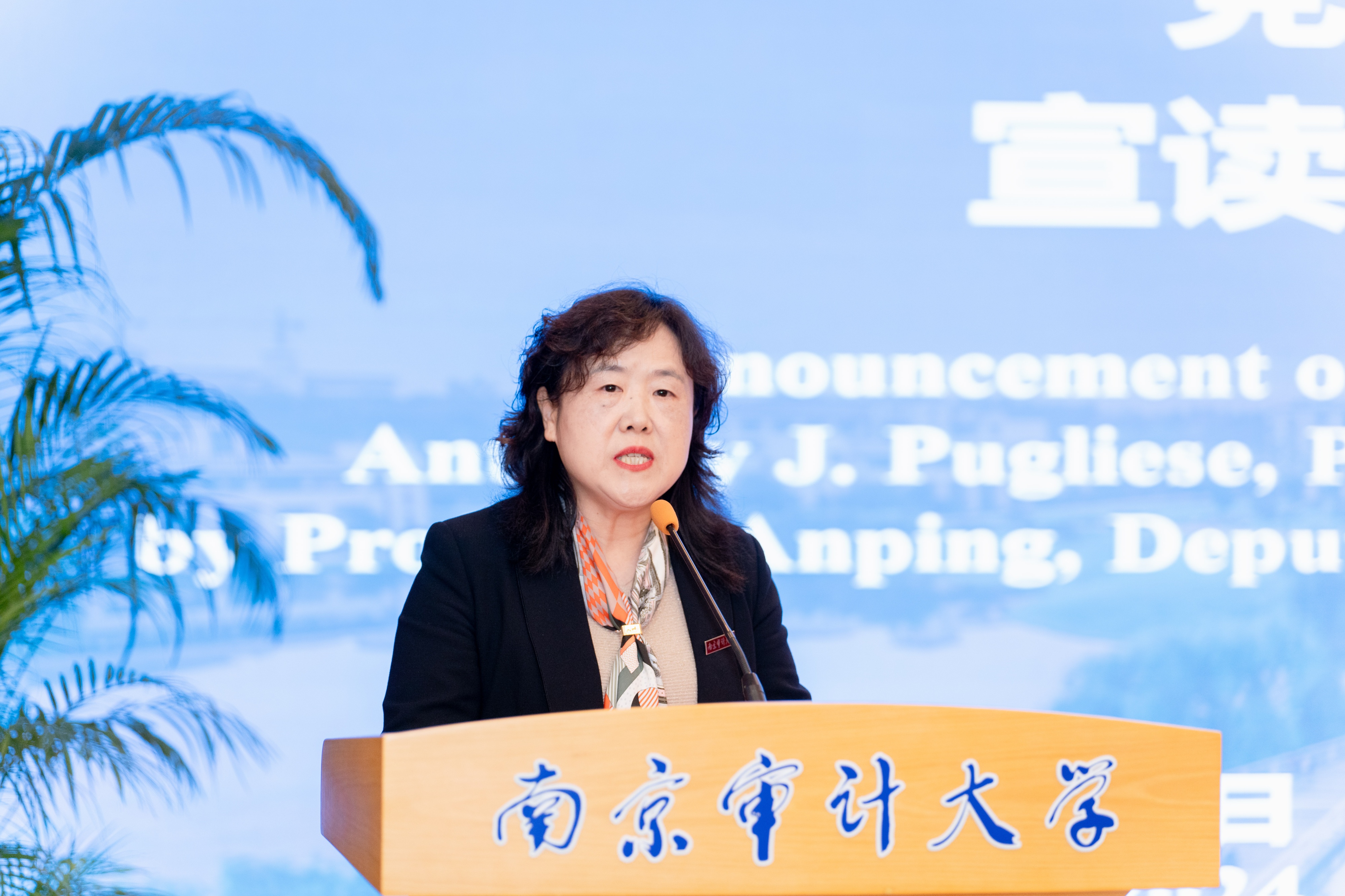 校黨委常委、副校長(zhǎng)盧亞娟宣讀《關(guān)于授予國(guó)際內(nèi)部審計(jì)師協(xié)會(huì)秘書長(zhǎng)兼首席執(zhí)行官安東尼·普耶茲先生榮譽(yù)教授學(xué)銜的決定》。