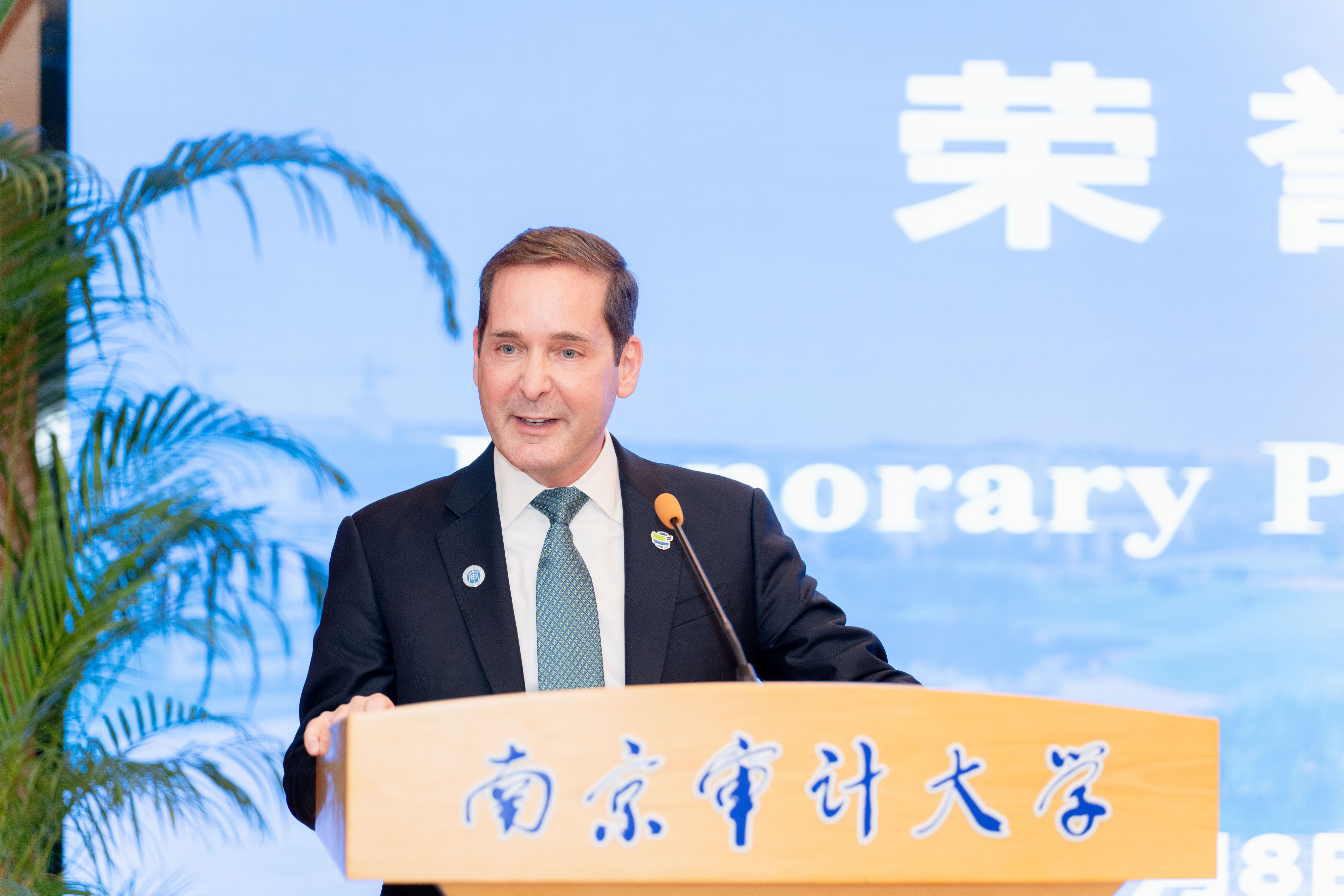 董必榮在致辭中代表全體師生向安東尼·普耶茲先生受聘擔(dān)任我校榮譽(yù)教授表示感謝。他指出,近年來南審與包括聯(lián)合國(guó)系統(tǒng)在內(nèi)的多家國(guó)際組織、行業(yè)組織建立了廣泛的合作關(guān)系,與國(guó)際內(nèi)部審計(jì)師協(xié)會(huì)友誼深厚。安東尼·普耶茲秘書長(zhǎng)及沈立強(qiáng)秘書長(zhǎng)一行的訪問,為我們?nèi)降挠押藐P(guān)系與交流合作開啟了新篇章,同時(shí)也為南審師生帶來了國(guó)際內(nèi)部審計(jì)領(lǐng)域的最新理念、寶貴經(jīng)驗(yàn)和寬廣視野。希望安東尼·普耶茲的加入為南京審計(jì)大學(xué)的教學(xué)、科研和國(guó)際交流帶來新的機(jī)遇和動(dòng)力,為南審師生開啟一扇通向國(guó)際內(nèi)部審計(jì)前沿的窗戶,促進(jìn)雙方在學(xué)術(shù)領(lǐng)域的深度交流與合作。