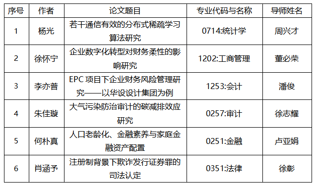根據(jù)《關(guān)于開展2024年江蘇省優(yōu)秀博士碩士學(xué)位論文評選工作的通知》(蘇教辦評函〔2024〕12號)文件精神,經(jīng)個(gè)人申報(bào)、學(xué)校推薦、省教育廳組織專家評議,我校共有6篇碩士學(xué)位論文入選(學(xué)術(shù)學(xué)位碩士學(xué)位論文2篇、專業(yè)學(xué)位碩士學(xué)位論文4篇)?,F(xiàn)予以公示,名單如下: