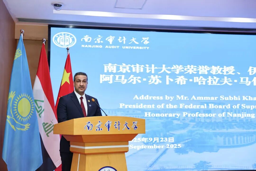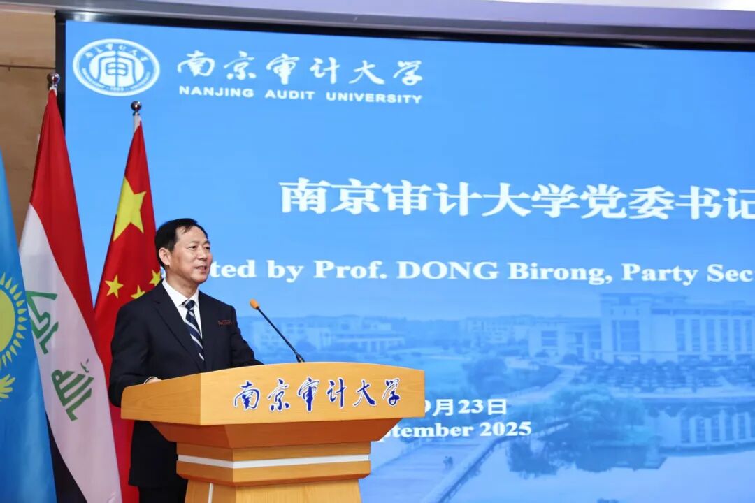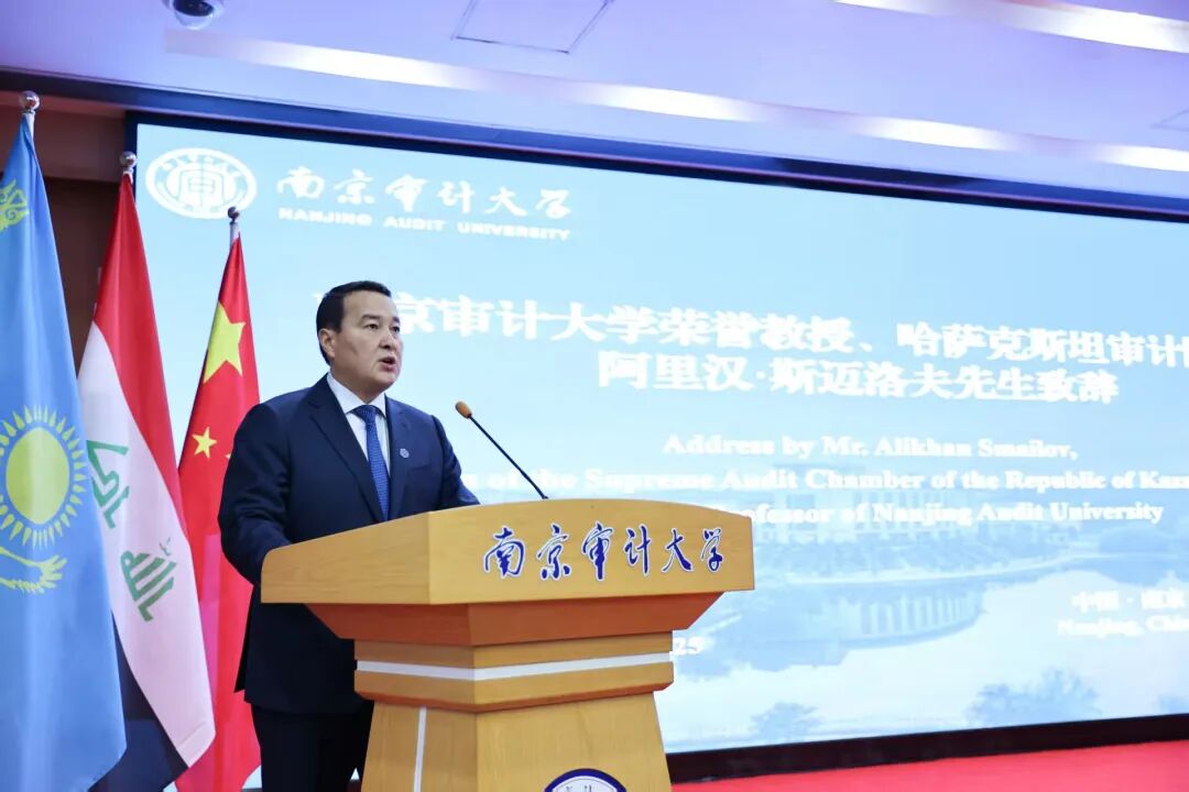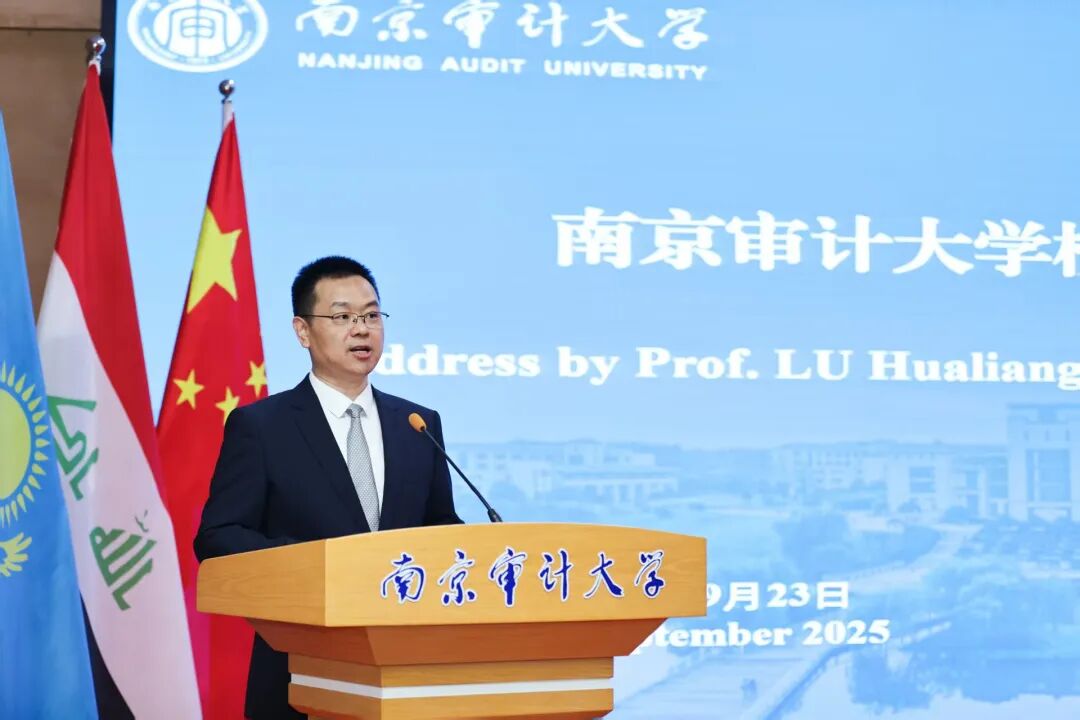 南京審計(jì)大學(xué)校長(zhǎng)陸華良教授致辭,他表示,兩位審計(jì)長(zhǎng)的到訪,是促進(jìn)人文交流、深化審計(jì)領(lǐng)域合作的具體行動(dòng),意義非凡。期待以此為契機(jī),在中國(guó)審計(jì)署的指導(dǎo)下,進(jìn)一步拓展與哈薩克斯坦、伊拉克兩國(guó)最高審計(jì)機(jī)關(guān)在科學(xué)研究、師生交流、聯(lián)合培訓(xùn)等方面的深度合作,攜手為提升亞洲審計(jì)能力、推動(dòng)全球治理體系變革貢獻(xiàn)智慧與力量。