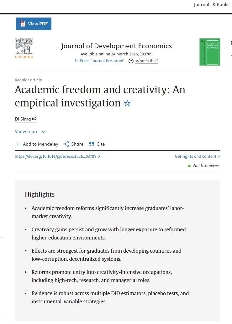 近日,我校教師司馬帝的獨作論文“Academic freedom and creativity: An empirical investigation”在國際期刊Journal of Development Economics上發(fā)表。